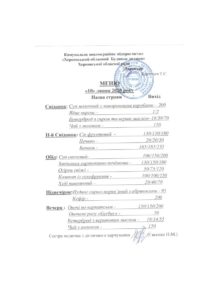Posted on 10.07.2020 / 0 / domrebenka З метою забезпечення відкритості та публічності інформації щодо якості харчування надаємо фото-звіти. Кількість осіб, що харчуються –64дітей, з них до року –8дітей. Вартість дня харчування –3193,70грн. Харчування
